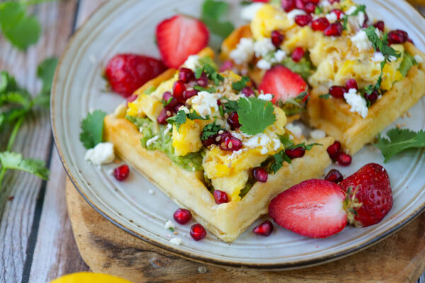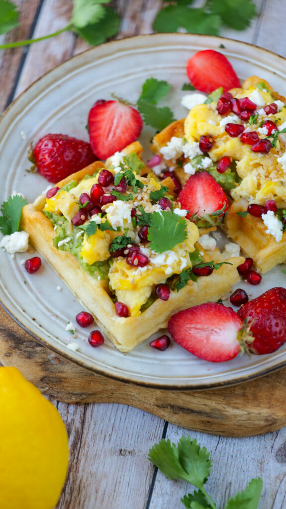 - Garnir les gaufres de guacamole, oeufs, brouillés, feta émiettée, grenade, coriandre ciselée et graines de sésame avant de déguster ! 🙂