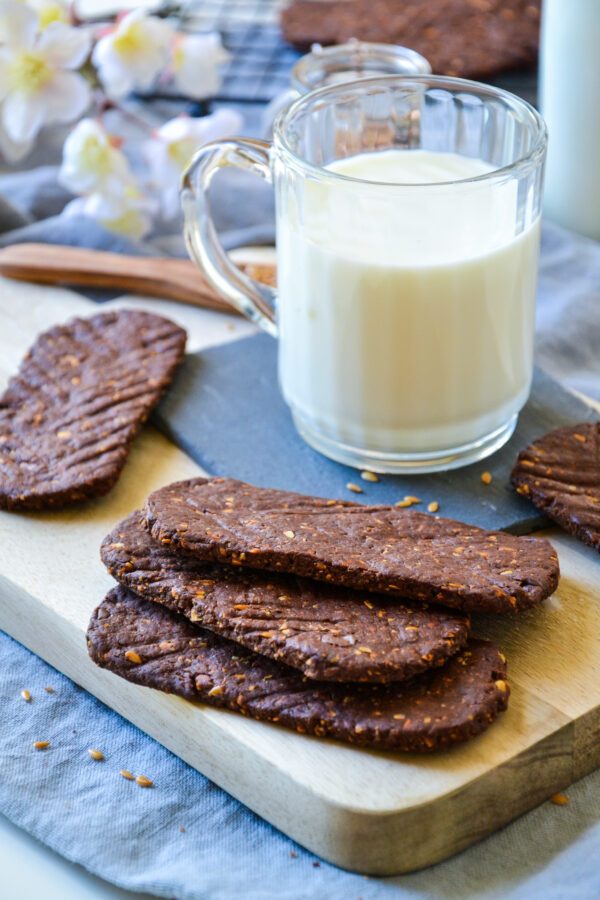 Des biscuits au cacao avec un léger goût de noisettes et de graines de lin : je vous présente ma revisite sans sucre raffiné et vegan des biscuits « belvita » : une version fait maison pour se régaler sans culpabiliser. Avec un verre de lait c’est un vrai régal 😉