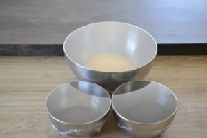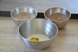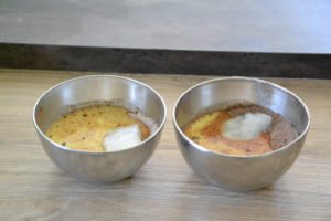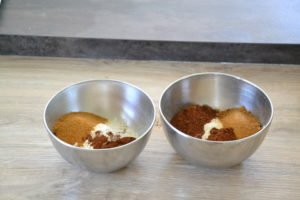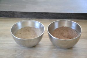 - Prendre deux petits saladiers et placer la farine, le cacao, le sucre de coco et le sel dans chacun.