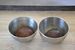 - Verser 60g de ce mélange dans la pâte 1 et le reste dans la pâte 2 (la plus foncée). Ajouter également l'huile.
