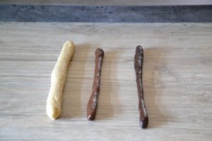 - Prendre un morceau de chaque couleur et effectuer des boudins en les roulant sur votre surface de travail.