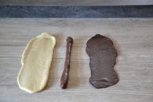 - Applatir la pâte nature et la pâte foncée à l'aide d'un rouleau.