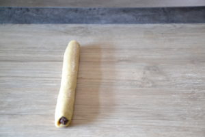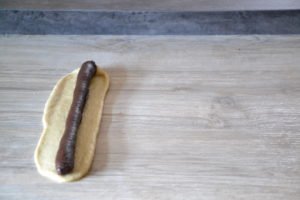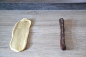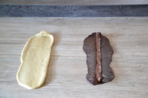 - Placer le boudin de pâte au cacao "1" sur le rectangle de pâte au cacao "2".