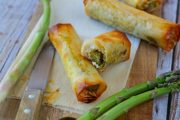 - Plier une ou deux asperges selon la taille en deux et les placer au centre d'une feuille de brick.
