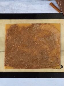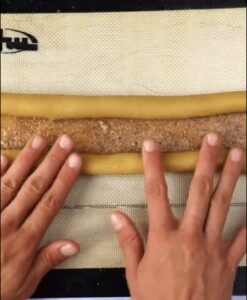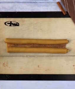 • Saupoudrer de sucre de canne ou de coco, ainsi que de cannelle. Couper les bords du rectangle de façon à ce qu’ils soient égaux.