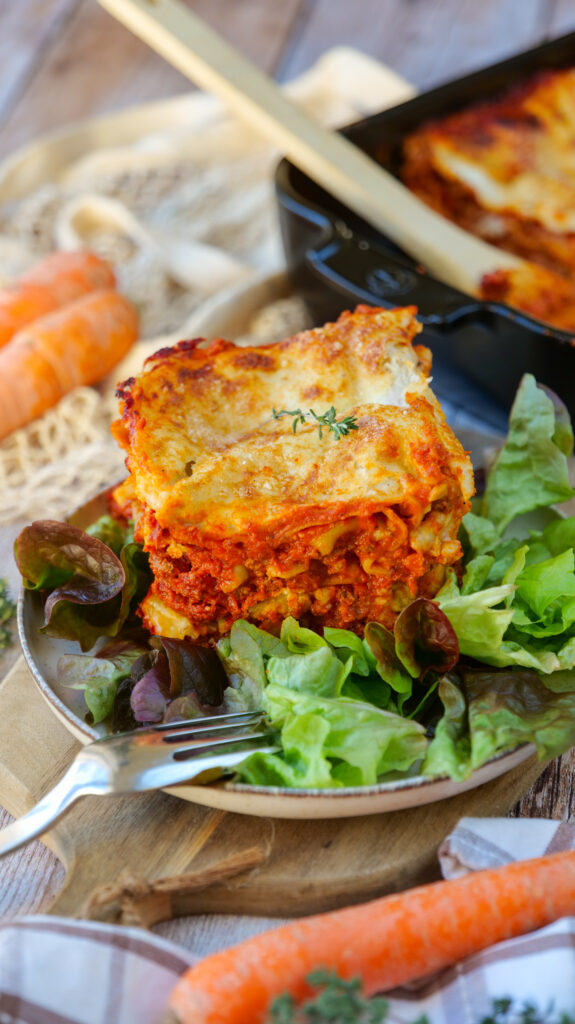 Les lasagnes… ce plat à la fois familial et réconfortant ! Je vous propose ma version avec une béchamel sans beurre ainsi que mon petit secret pour des lasagnes savoureuses : une bolognaise mijotée longtemps qui sera juste divine et fera toute la différence ! 🙂 Testez et vous m’en direz des nouvelles 🙂