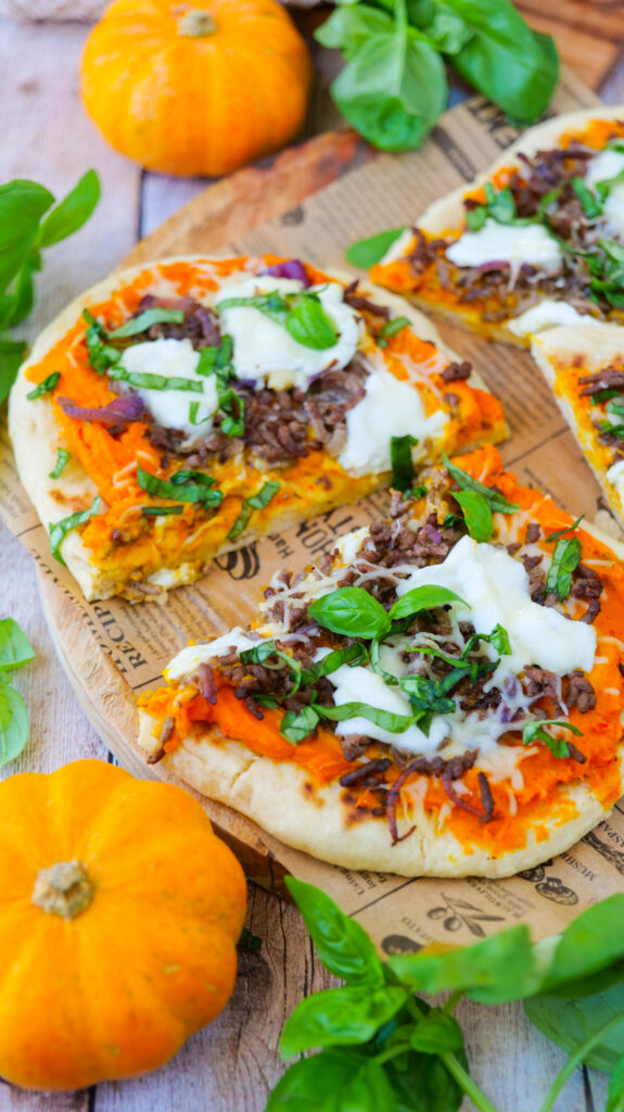 Vous aimez la pizza ? Vous aimez les naans ? Alors je vous propose aujourd’hui de mixer les deux dans une version automnale 🙂 Un naan façon pizza garni de purée de potimarron, boeuf haché, mozzarella, basilic et miel pour un plat gourmand à déguster avec une bonne salade 🙂