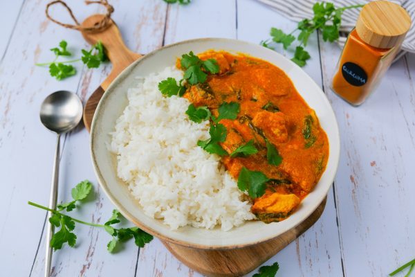 Ce soir je vous propose un voyage en Inde avec ce savoureux poulet à l’Indienne accompagné de riz et d’épinards. Un plat facile à préparer pour un voyage garanti des papilles 🙂 !