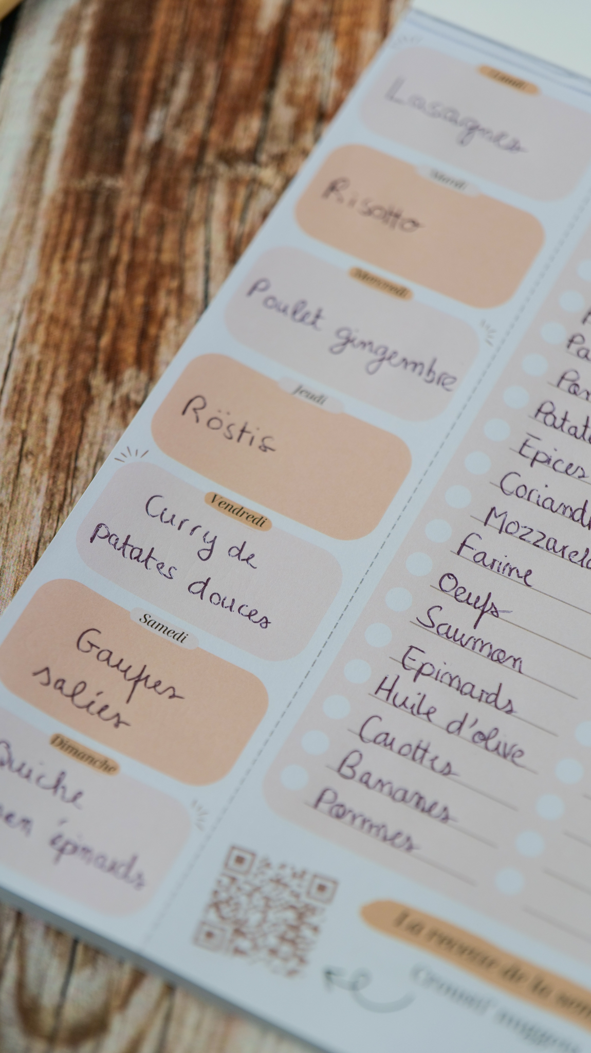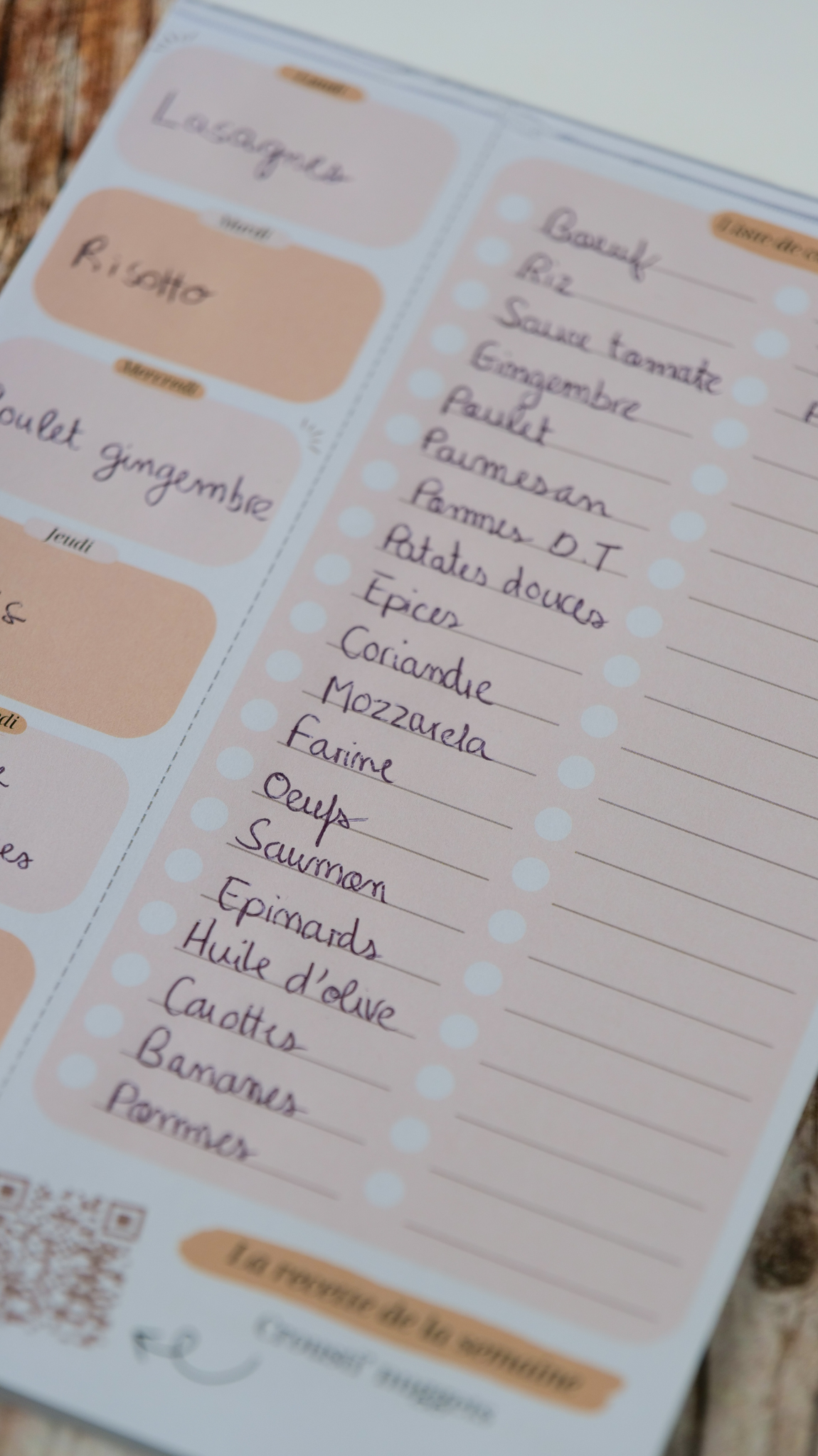 Un organiseur au top, vraiment bien fait et bien pensé. Le plus, les 2 parties détachables : l’une avec les menus collée au frigo, l’autre pour les courses dans le sac avec la CB !