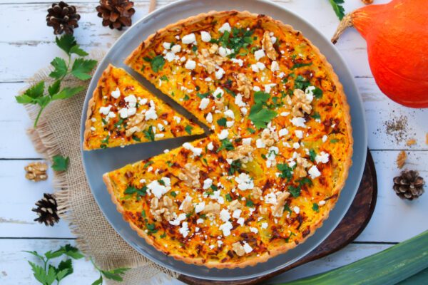 Quiche au potimarron, poireau, feta et noix
