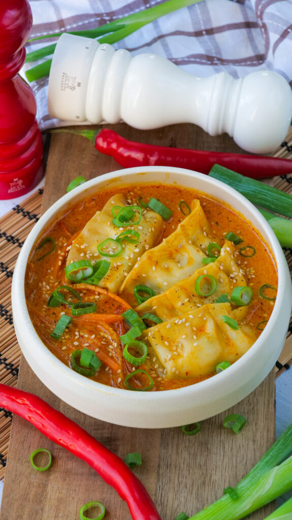 - Ajouter ensuite la pâte de curry, le bouillon et le lait de coco. Laisser mijoter à feu moyen pendant environ 5 minutes avant de plonger les gyosas pour quelques minutes (le temps de cuisson peut varier selon les marques ou s'ils sont maison ; environ 3-4 minutes).