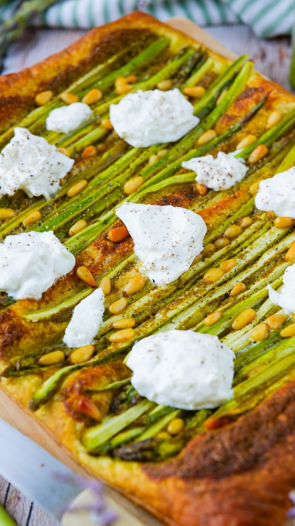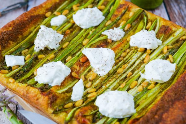 C’est la saison des asperges ! Voici donc une nouvelle recette qui sent bon le printemps 🙂 Une délicieuse tarte aux asperges, pesto et burrata aussi simple que rapide à préparer !