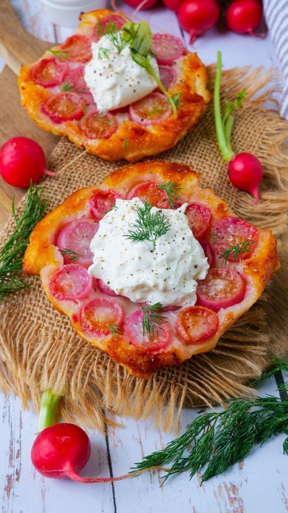 - Recouvrir des carrés de pâte feuilletée et replier les coins de façon à emprisonner les radis. Piquer la pâte et enfourner pendant 15 minutes.