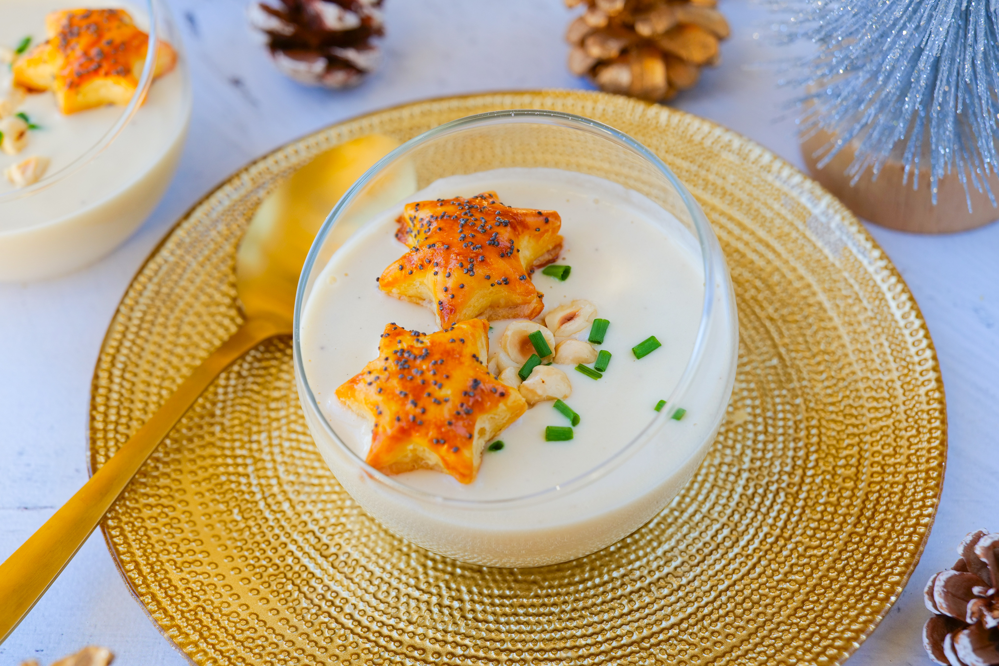• Déposer le velouté dans des petits bol ou verrines et parsemer de noisettes concassées ainsi que de la ciboulette ciselée. Disposer quelques étoiles feuilletées sur des pics et servir bien chaud !