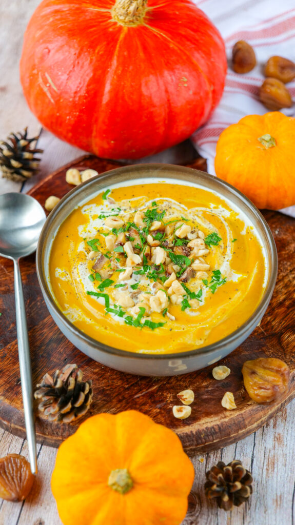 Qui dit automne, dit velouté chauds et réconfortants ; alors voici une nouvelle recette de velouté crémeux à souhaits au potimarron et à la châtaigne : un mélange ultra gourmand qui régalera vos papilles 🙂