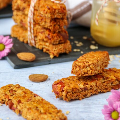 Répartir la préparation dans des moules à barres de céréales ou dans un petit plat à gratin chemisé de papier cuisson. Tasser au maximum à l’aide d’une maryse ou d’un couvercle afin de souder les flocons d’avoine.