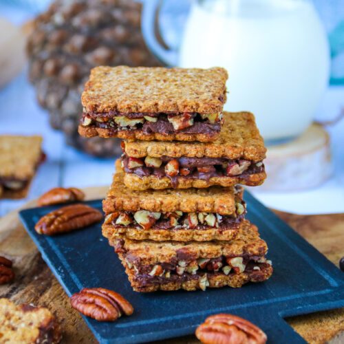 Une fois froids, déposer une cuillère à café de pâte au chocolat sur chaque biscuit. Saisir deux biscuits recouverts de chocolat puis recouvrir l’un d’entre eux de noix de pécan concassées. Refermer en superposant les biscuits.