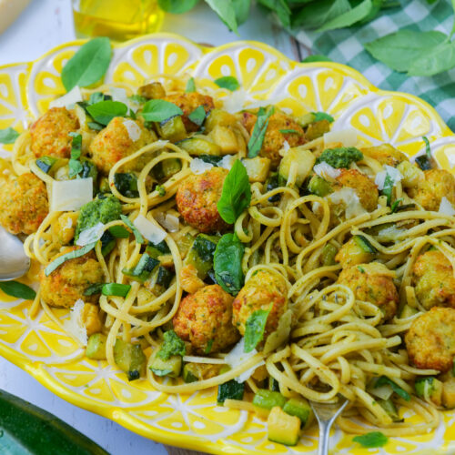 Une fois toutes les préparations cuites, mélanger sur feu doux les pâtes égouttés, les courgettes, les boulettes, la louche d'eau de cuisson, et le pesto.