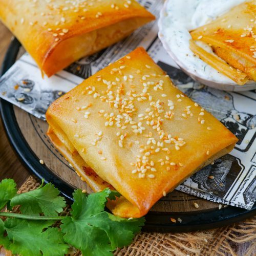 Préchauffer le four à 180° (chaleur tournante). Déposer les bricks sur la plaque du four recouverte de papier cuisson. Les badigeonner d'huile d'olive avec un pinceau et parsemer de graines de sésame.