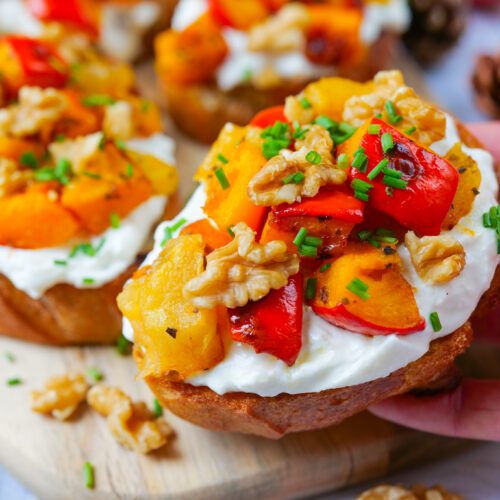 Ajouter 1/4 de burrata sur chaque tartine, suivi du mélange pomme et potimarron. Parsemer de noix ainsi que de ciboulette ciselée avant de déguster :)