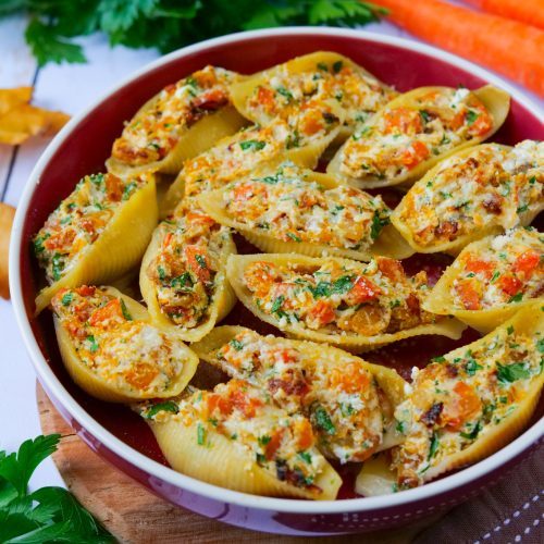Garnir les conchiglionis avec la préparation légumes et ricotta et les disposer dans le plat. Préchauffer également le four à 180° (chaleur traditionelle).