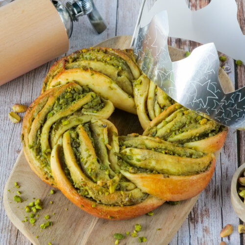 Répartir la crème de pistache sur le rectangle de pâte. Saupoudrer de pistaches concassées et d'un peu de cardamome moulue si souhaité. Placer la fève puis rouler ce rectangle dans la longueur de façon à former un grand boudin.
