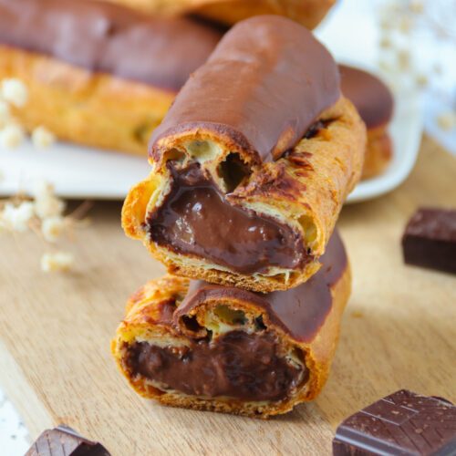 Remplir une poche à douille de pâte et réaliser 5 éclairs d'environ 13 cm de longueur sur une feuille ou un tapis de cuisson.
