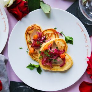 Servir les blinis tièdes avec les oignons et les cubes de mangue caramélisés, ainsi que quelques tranches de foie gras végétal. Bonne St Valentin :)