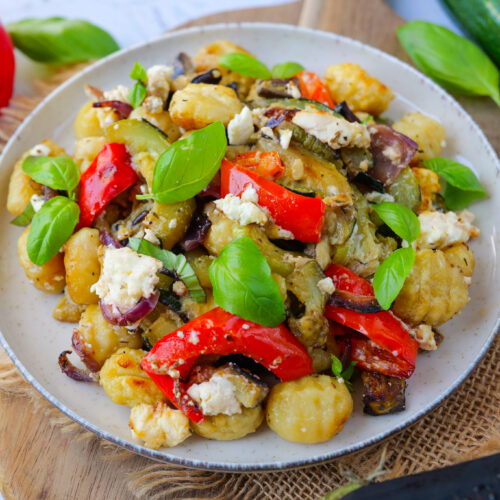 Après ce temps de cuisson, ajouter les gnocchis (s'assurer de ne pas à avoir à la cuire à l'eau au préalable, selon les marques ou s'ils sont fait maison) et la feta émiettée. Mélanger et enfourner de nouveau pendant 10 minutes.