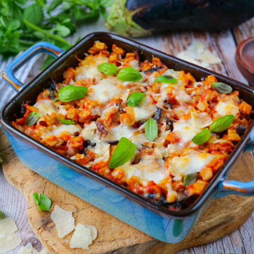 Verser le tout dans un plat à gratin et parsemer de Parmesan râpé. Enfourner de nouveau à 180° pendant environ 15 minutes. À la fin de la cuisson, ajouter du basilic frais ciselé. Conservation : au réfrigérateur pendant 4 jours.