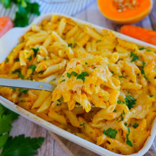 Mélanger les pâtes égouttées avec la sauce carotte et butternut (et du jambon tranché si souhaité). Déposer le tout dans un plat à gratin et parsemer de Parmesan râpé. Enfourner à 200° en haut du four pendant 10 minutes jusqu'à ce que la préparation soit gratinée.