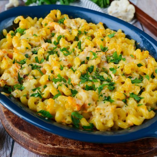 Dans un grand plat à gratin, déposer les pâtes cuites, les fleurettes de chou-fleur rôties et le saumon émietté. Mélanger le tout puis verser la béchamel. Mélanger une dernière fois afin que tous les ingrédients soient bien imprégnés.
