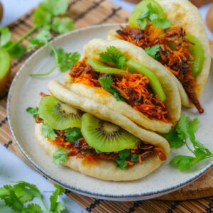 À la fin de la cuisson, le jus doit avoir réduit et la viande doit s’effilocher facilement. Effilocher toute la pièce de viande à l’aide d’une fourchette et la mélanger au jus. Réserver.