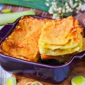 Repartir un peu d’huile d’olive au fond d’un plat à gratin puis recouvrir d’une ou deux feuilles de lasagne selon la taille du plat. Ajouter une cuillère de poireaux à la crème, recouvrir de feuilles de lasagnes et ainsi de suite.