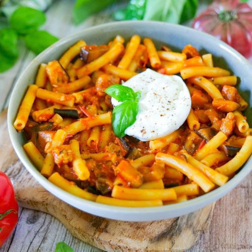 Déglacer avec la sauce tomate et une louche d'eau de cuisson des pâtes. Mélanger puis baisser le feu pour faire mijoter la préparation pendant quelques minutes.