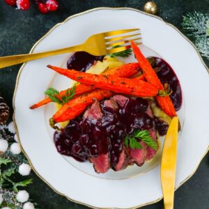 Dresser vos assiettes avec 1/3 magret de canard tranché par personne, 2 à 3 carottes rôties, un peu d'écrasé de pommes de terre, la sauce au vin rouge, un tour de poivre et quelques branches de persil frais. Joyeux Noël !