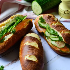 J'ai tout simplement tartiné les pains de fromage frais à l'ail et aux fines herbes, de saumon et concombre :) un vrai régal ;)