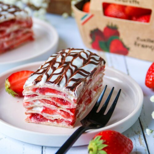 Mille-feuilles de crêpes aux fraises, crème coco-vanille