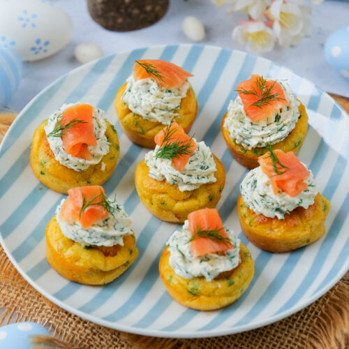 Une fois les minis muffins cuits et refroidis, ajouter le topping au fromage frais, quelques morceaux de truite fumée par dessus et un brin d’aneth.