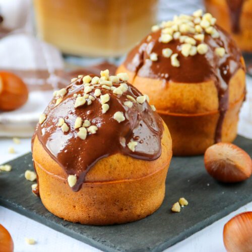 Pendant que les muffins cuisent, faire fondre un peu de chocolat noir dans un bol. Une fois les muffins cuits et bien refroidis, recouvrir leur surface avec un peu de chocolat fondu et de noisettes concassées !