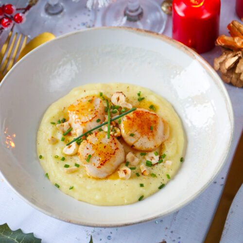 Déposer la purée au centre de chaque assiette. Ajouter 3 noix de Saint Jacques par assiette, parsemer des noisettes torréfiées, de ciboulette ciselée et ajouter un peu de réduction d'orange. Terminer par un tour de moulin à poivre et d'une pincée de sel et servir immédiatement :)