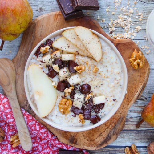 Une fois le porridge épaissi et crémeux, le déposer dans un bol ou une assiette creuse. Ajouter les morceaux de poire, de chocolat et de noix puis déguster* !