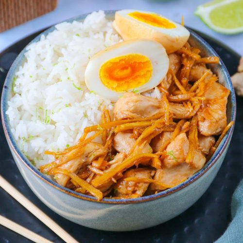 Servir le poulet au gingembre avec le riz cuit et si souhaité un peu de zestes de citron vert !