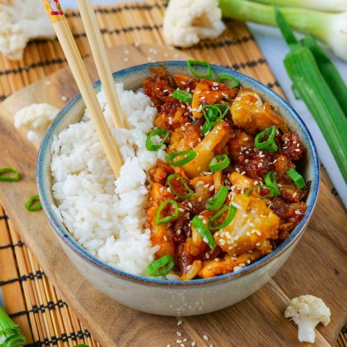 Dresser le riz dans des bols avec le poulet et le chou-fleur caramélisé. Ajouter un peu de tiges d'oignon vert ciselées et de graines de sésame avant de déguster ! :)