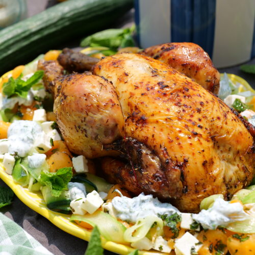 Servir le poulet rôti avec la salade fraîcheur et la sauce blanche en accompagnement !