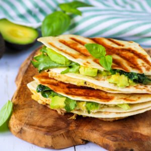 Placer les éléments suivants sur chaque quart de la tortilla : le houmous, les miettes de poulet émincées, l’avocat avec la salade et le basilic, ainsi que le fromage râpé.