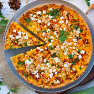 Enfourner pendant 30 à 35 minutes en baissant un peu la température du four à mi-cuisson. A la fin de la cuisson, laisser tiédir et parsemer la quiche du restant de feta, de quelques noix concassées et de persil ciselé !