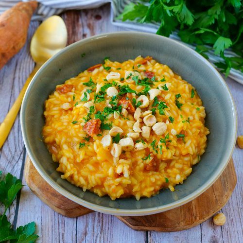 Laisser le vin s'évaporer avant d'ajouter une première louche de bouillon, ainsi que la purée de patate douce.