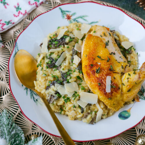 Dresser le risotto dans des assiettes creuses avec les suprêmes de volaille ainsi qu'un peu de ciboulette ciselée !