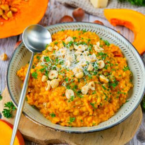 Lorsque le riz sera bien cuit, couper le feu et ajouter le Parmesan râpé, quelques noisettes concassées, du persil ciselé et du poivre avant de déguster bien chaud :)
